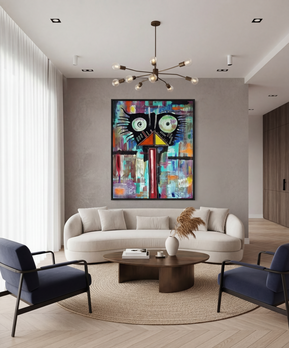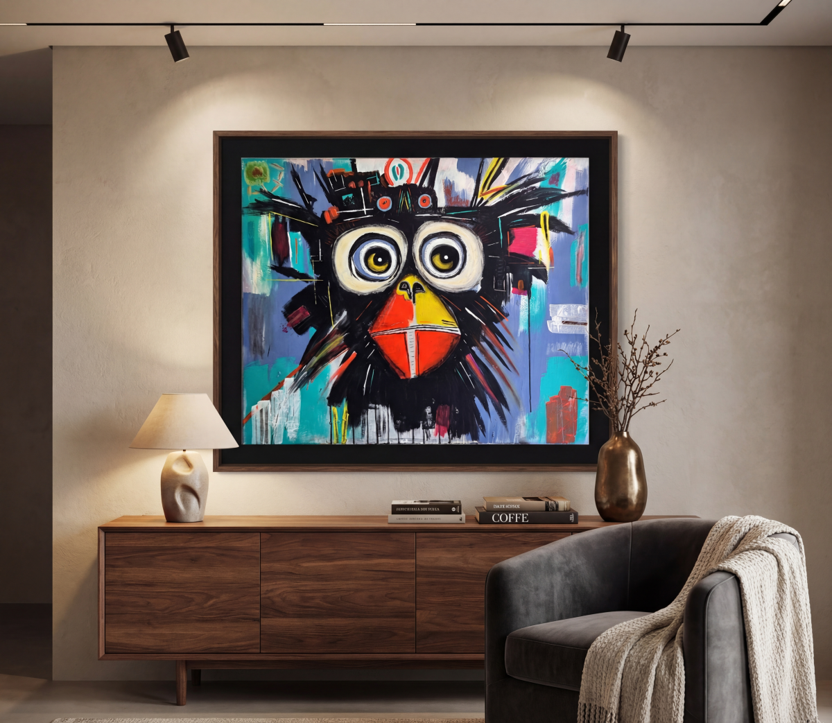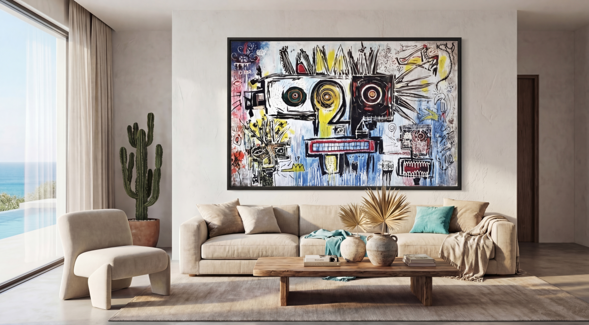 Ce tableau acrylique grand format met en scène un singe au visage stylisé, capté dans un instant suspendu. Ses grands yeux ronds, profonds et lumineux, attirent irrésistiblement le spectateur.