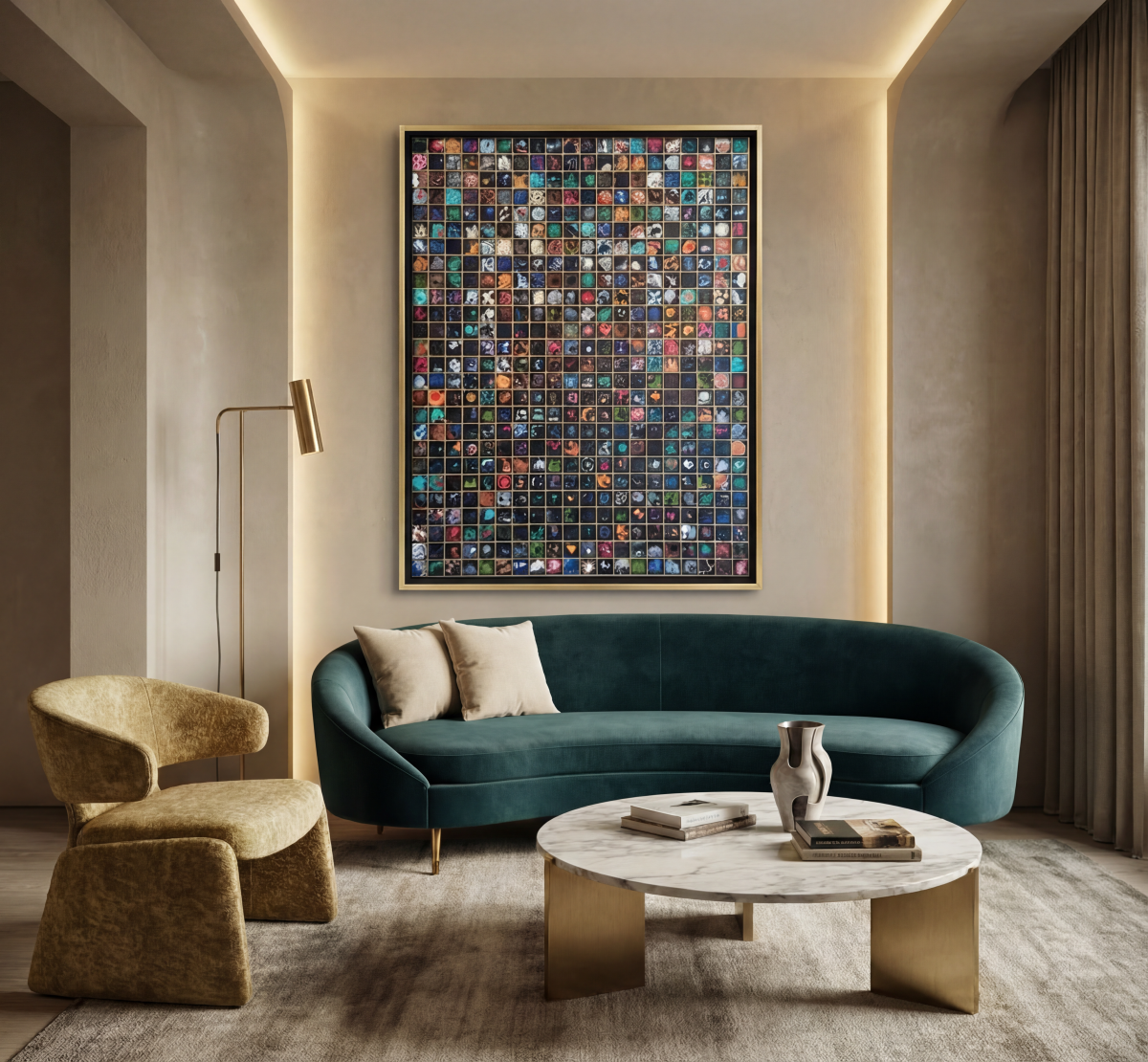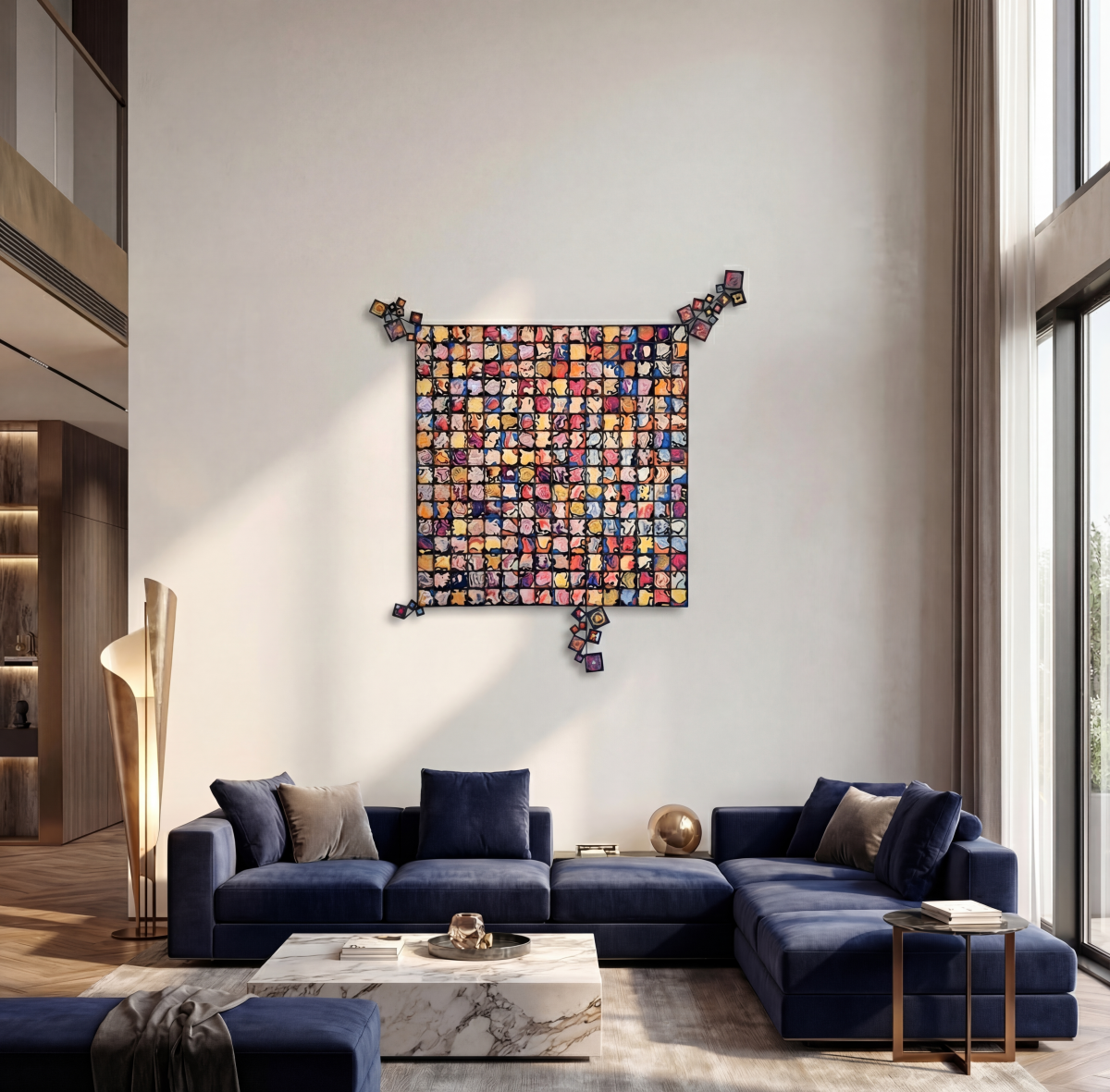 Univers s’inscrit dans la série des Carrés, mais en repousse l’ambition : ici, chaque case devient une fenêtre abstraite ouverte sur le cosmos. L’oeuvre est composée d’une multitude de petits modules créés en impression 3D, ensuite patinés à la peinture dorée