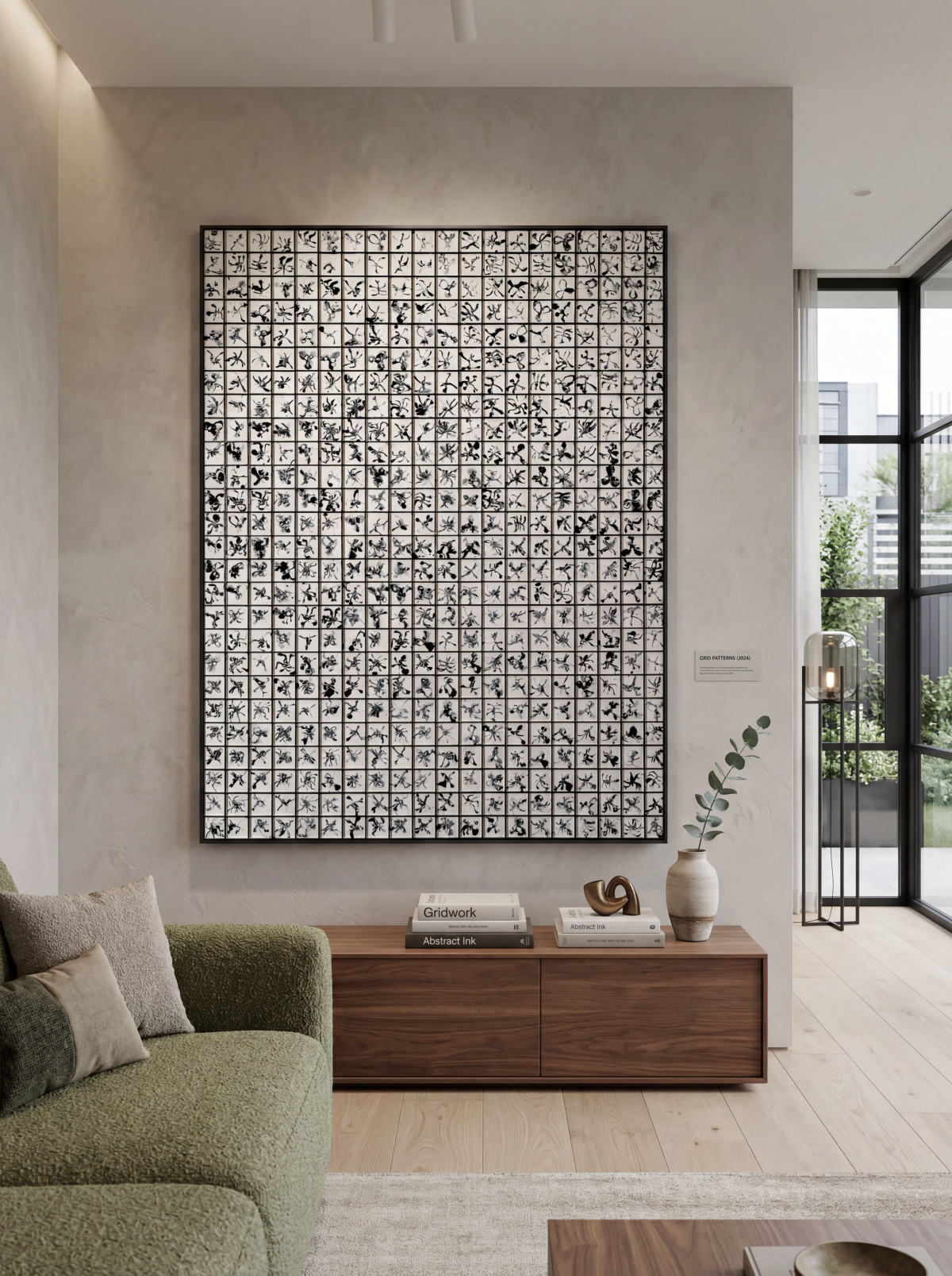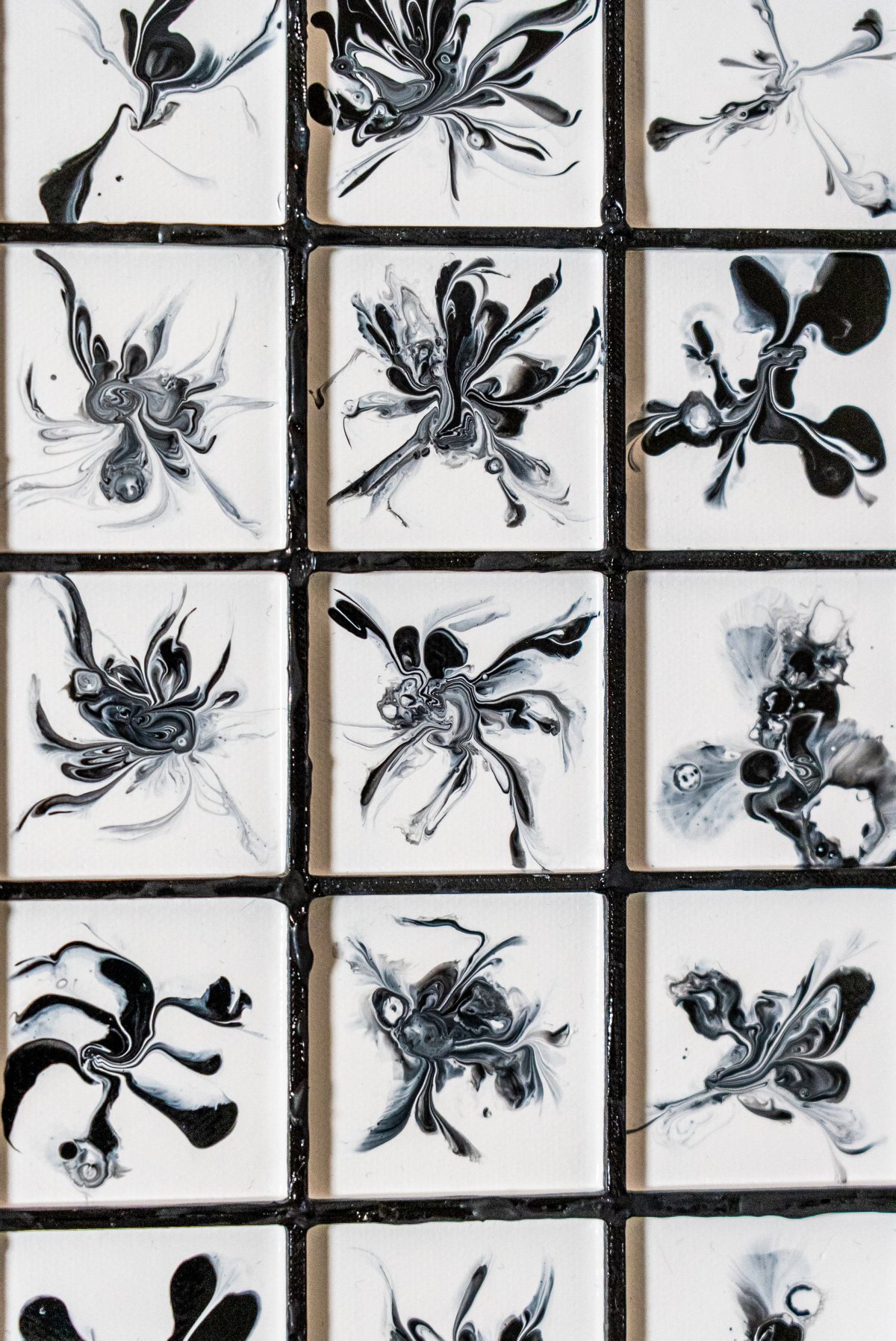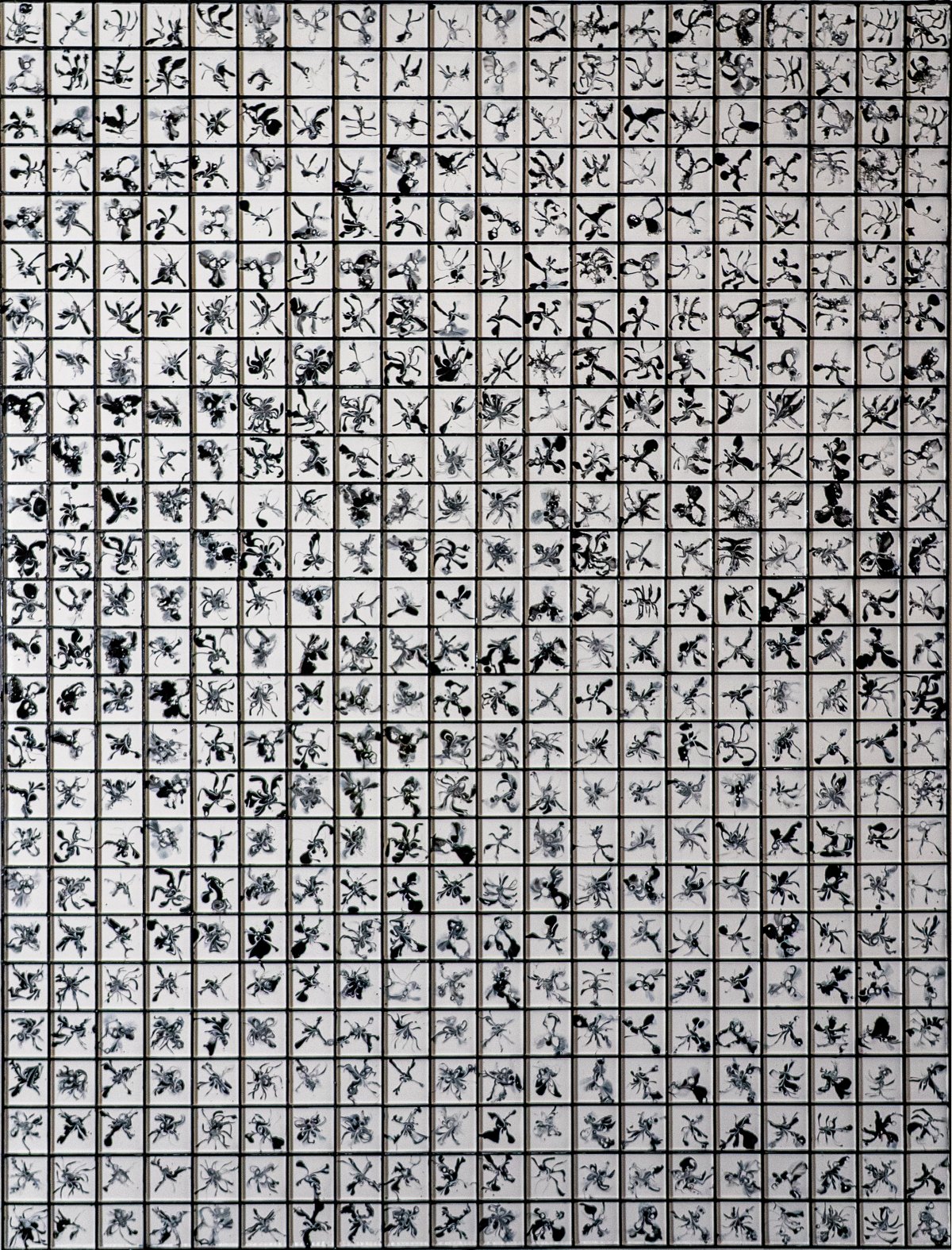 Attrape-Rêves s’inscrit dans la continuité de la série carrés abstraits comme une cartographie mentale, un territoire de l’inconscient fragmenté en une multitude de cellules. Le tableau se compose d’une grille rigoureuse de cases blanches, chacune abritant en son centre une forme noire, unique, flottante, presque en suspension. À première vue, l’ensemble semble répétitif et ordonné, mais très vite, le regard se perd dans une infinité de variations. Ces formes noires, tantôt légères, tantôt plus denses, évoquent des présences incertaines. Elles oscillent entre l’organique et l’imaginaire : on croit y distinguer des insectes, des créatures hybrides, des fragments de corps, ou encore de minuscules scènes figées, comme des instantanés de rêves. Rien n’est jamais totalement défini. Chaque forme reste volontairement ambiguë, laissant place à la projection, à l’interprétation personnelle, à la pareidolie. Le noir et blanc accentue cette impression de souvenir flou, comme si ces images provenaient d’un espace mental où la couleur n’existe plus, où seules subsistent des silhouettes, des traces, des résidus de pensées nocturnes. Le fond blanc agit comme un silence, un espace vide dans lequel ces formes apparaissent puis disparaissent, à la manière d’images surgissant dans un rêve avant de s’effacer. Le titre Attrape-Rêves prend alors tout son sens. Le tableau semble capter ces visions diffuses que l’esprit fabrique pendant le sommeil : monstres inoffensifs, peurs abstraites, fragments de vie quotidienne déformés, mélangés, recomposés. Chaque case devient un micro-rêve, une unité autonome, mais l’ensemble forme un flux continu, une accumulation presque hypnotique. En invitant le spectateur à s’attarder sur chaque détail, Attrape-Rêves propose une expérience contemplative et introspective. Plus on observe, plus le tableau se peuple. Ce qui était abstrait devient narratif, sans jamais perdre son mystère. L’œuvre se situe ainsi à la frontière entre abstraction et figuration, entre contrôle et chaos, entre veille et sommeil.