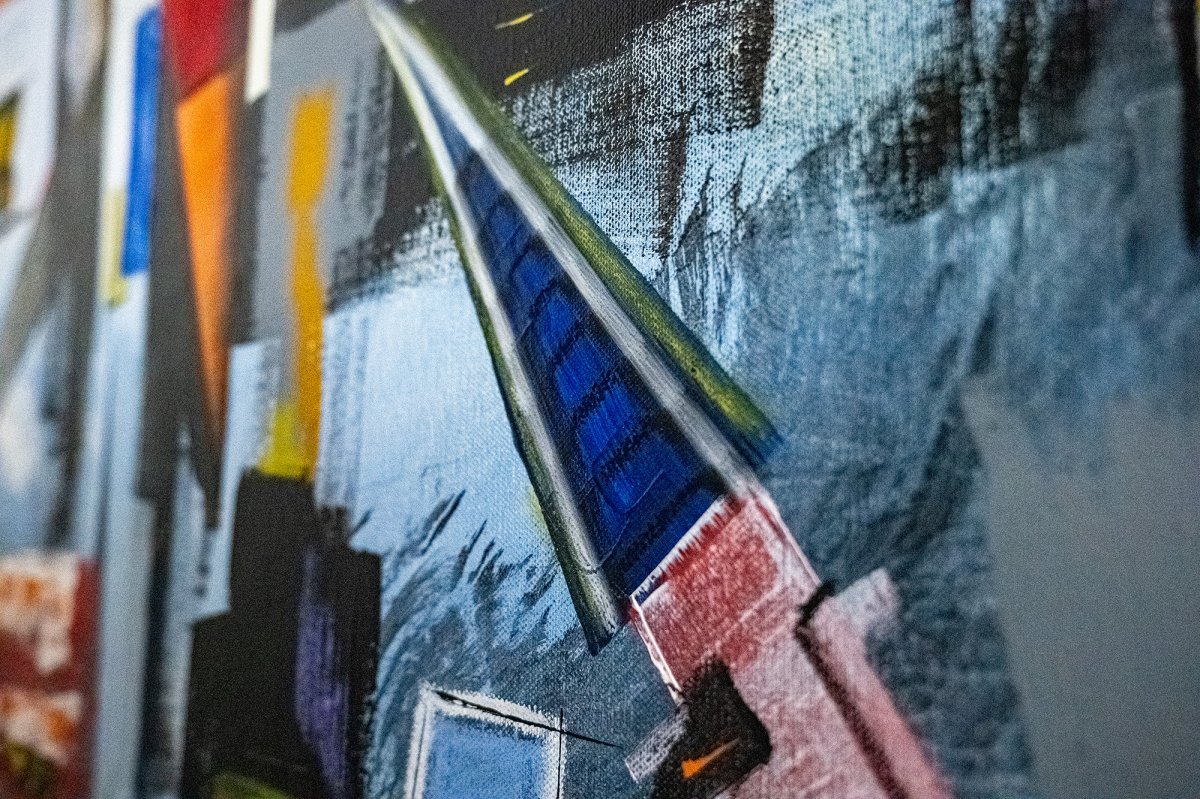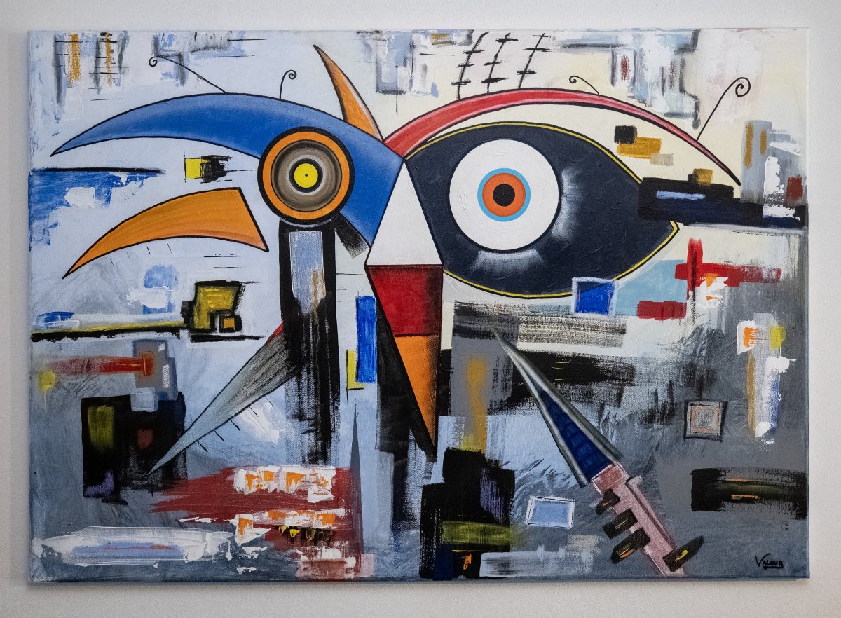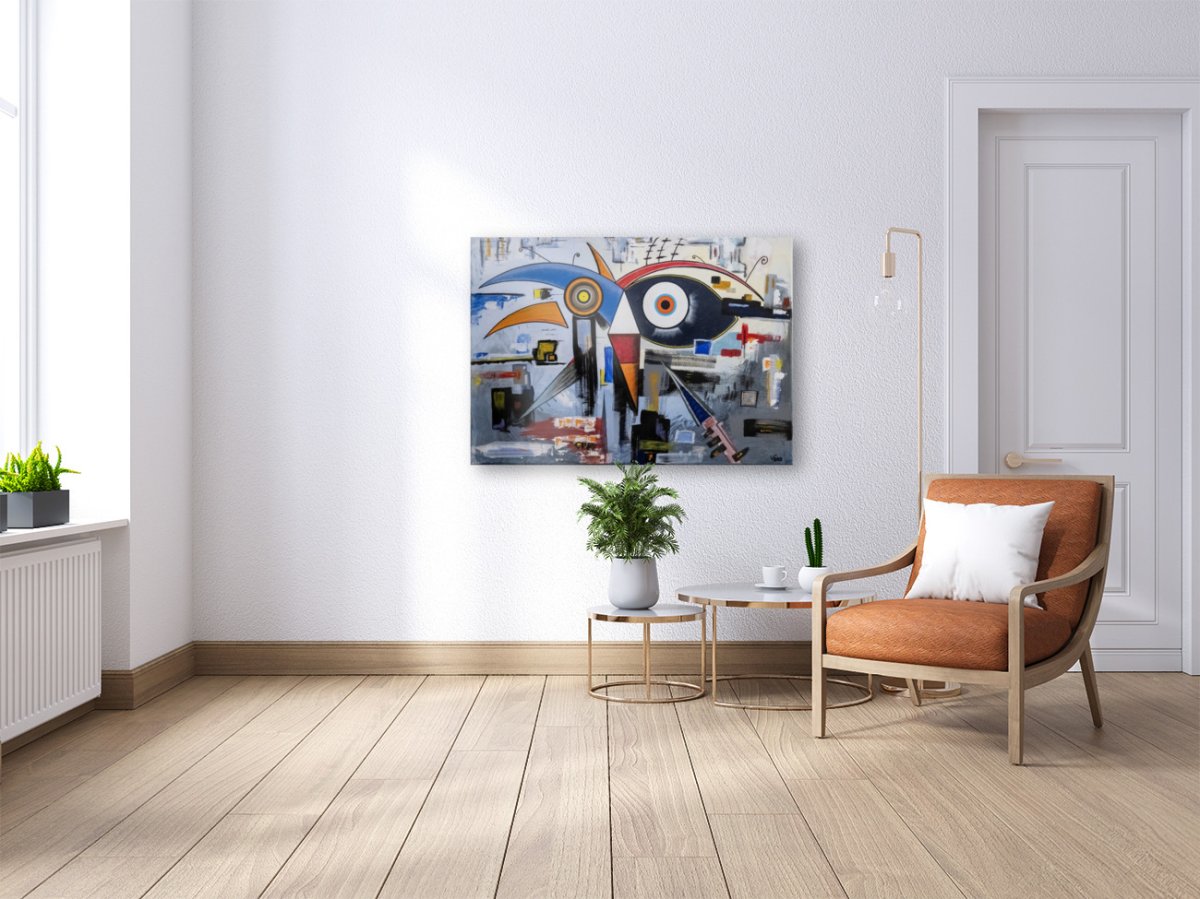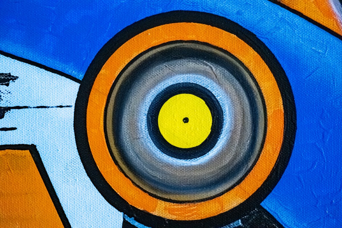 Ce tableau attire d’emblée par l’intensité de son regard monumental. Deux grands yeux ronds dominent la composition et captivent le spectateur, comme s’ils cherchaient à l’hypnotiser. Construits à partir de cercles concentriques, ils évoquent à la fois la pureté d’une cible graphique et la complexité d’un regard intérieur. L’effet hypnotique est immédiat : impossible de détourner les yeux de cette présence frontale et troublante. L’ensemble du visage est suggéré à travers des lignes et des courbes géométriques qui s’entrecroisent, formant une structure presque mécanique. Pourtant, derrière cette construction rigoureuse, l’émotion demeure : une intensité fragile, un mélange d’interrogation et de fascination. Le contraste entre abstraction et figuration donne à l’œuvre sa force singulière. L’oeil gauche, en particulier, est accentué par un élément intrusif qui ressemble à une lance ou une fusée pointée droit vers lui. Cette présence dérangeante intensifie l’ambiguïté de la scène : menace ou propulsion, attaque ou élan ? Ce détail invite à lire le tableau comme une tension permanente entre vulnérabilité et puissance, entre cible et projectile. Le fond, foisonnant et abstrait, construit par une mosaïque de formes colorées et de textures, sert d’écrin vibrant au regard central. Il accentue la sensation que les yeux émergent, qu’ils transpercent le chaos environnant pour se fixer sur le spectateur. À travers Mr BigEyes, on explore le pouvoir du regard comme miroir et comme arme, capable d’attirer, d’interroger et même de mettre mal à l’aise. Un face-à-face direct, à la fois ludique et perturbant, qui interroge notre propre manière de voir et d’être vu.