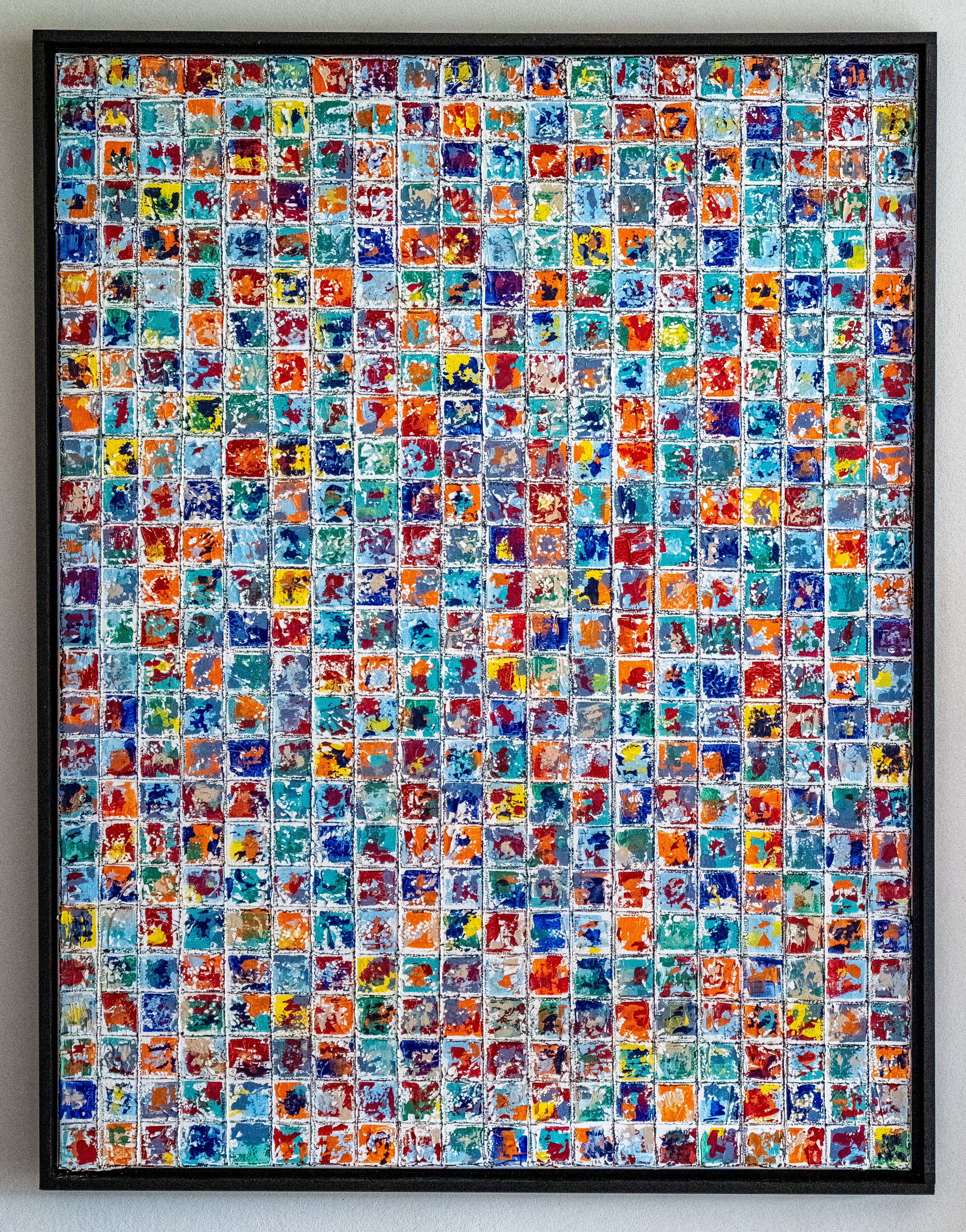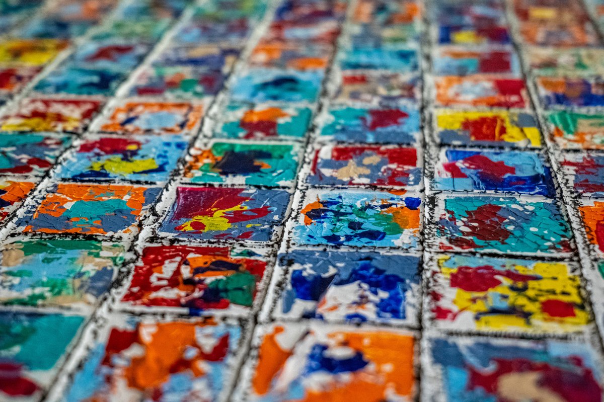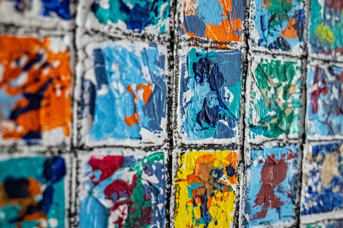 “Holywood Stories” est une oeuvre vibrante et foisonnante, composée d’une multitude de petites vignettes abstraites qui s’assemblent en un grand mur d’histoires. Chaque carré, comme une scène fugitive, capture un instant de vie sous le soleil éclatant d’Hollywood. Les couleurs chaudes et lumineuses – rouge flamboyant, orange solaire, bleu azur, turquoise et touches de jaune – évoquent l’énergie, la joie et l’intensité des émotions que l’on retrouve dans cette cité mythique du cinéma. L’ensemble forme une mosaïque dynamique, presque cinématographique, où le spectateur peut voyager librement. L’intention est d’ouvrir un espace d’interprétation : chaque spectateur est invité à projeter ses propres récits dans cette constellation de fragments visuels. L’oeuvre devient ainsi un miroir des histoires personnelles et collectives, un kaléidoscope d’instants capturés et réinventés. “HolywoodStories” est à la fois une célébration de la lumière, du rêve et de l’évasion, et une invitation à plonger dans une infinité de petites histoires que chacun peut raconter à sa manière.