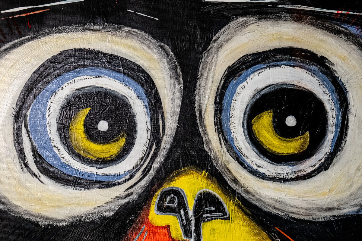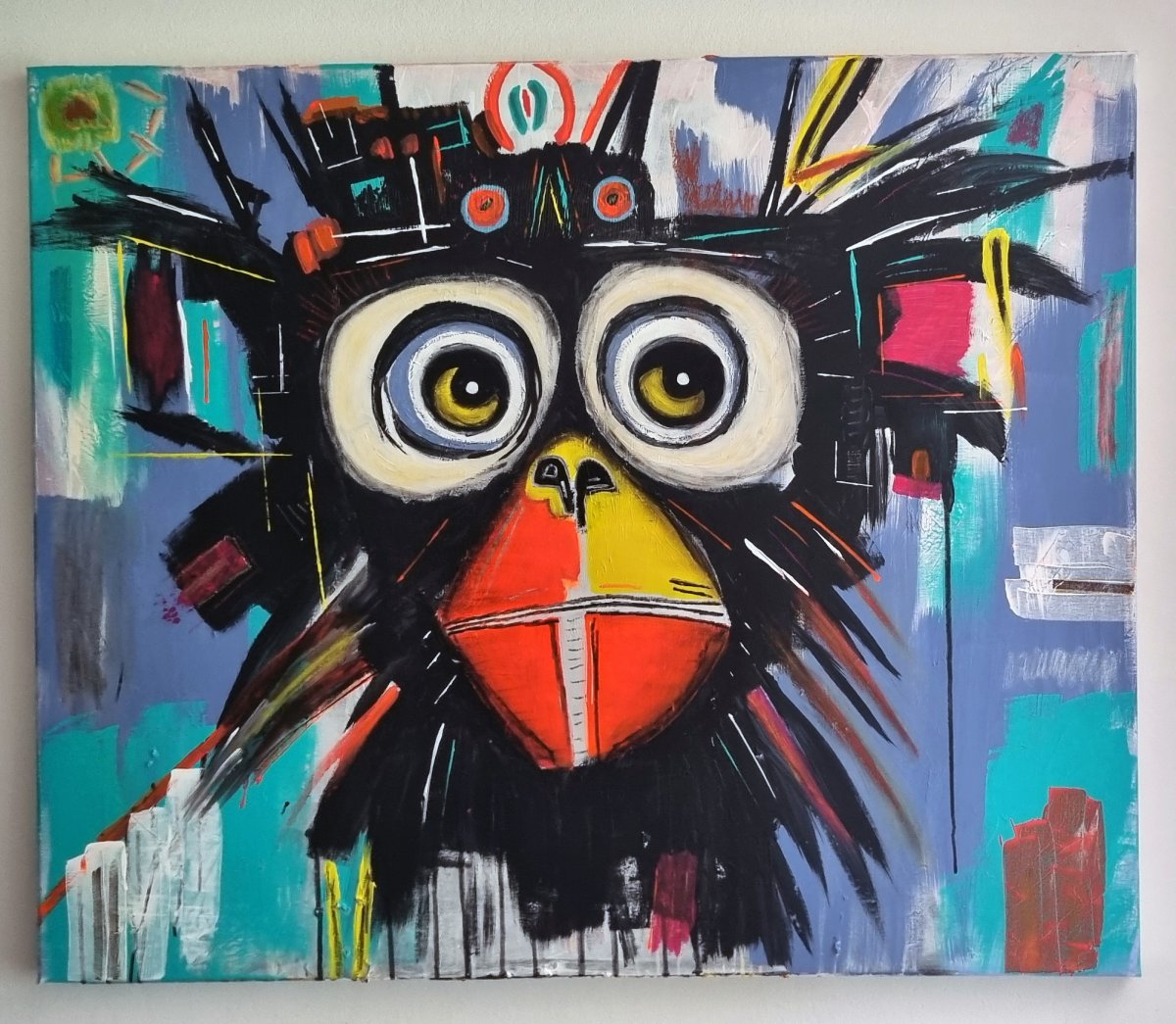 Ce tableau acrylique grand format met en scène un singe au visage stylisé, capté dans un instant suspendu. Ses grands yeux ronds, profonds et lumineux, attirent irrésistiblement le spectateur. Le regard, légèrement tourné vers la droite, semble se projeter au-delà du cadre, symbole d’un futur incertain mais porteur d’espoir. Cette orientation n’est pas anodine : elle traduit un élan vers l’avant, une curiosité, mais aussi une forme de retenue, comme si l’animal contemplait un horizon lointain avec prudence. La mélancolie affleure dans cette expression, subtile et silencieuse, évoquant le souvenir d’un passé ou la conscience des défis à venir. Elle contraste avec l’éclat des couleurs vives – rouge ardent, jaune solaire, turquoise vibrant – qui animent la toile et insufflent une énergie presque sauvage. Les traits noirs, nerveux et rayonnants autour de la tête, ajoutent une intensité dramatique et rappellent la force brute de la vie. L’arrière-plan abstrait, construit en aplats colorés et éclats graphiques, encadre la figure tout en suggérant un monde en mouvement. L’ensemble forme un dialogue entre émotion et énergie, où l’avenir se devine dans un regard chargé de tendresse et de gravité.