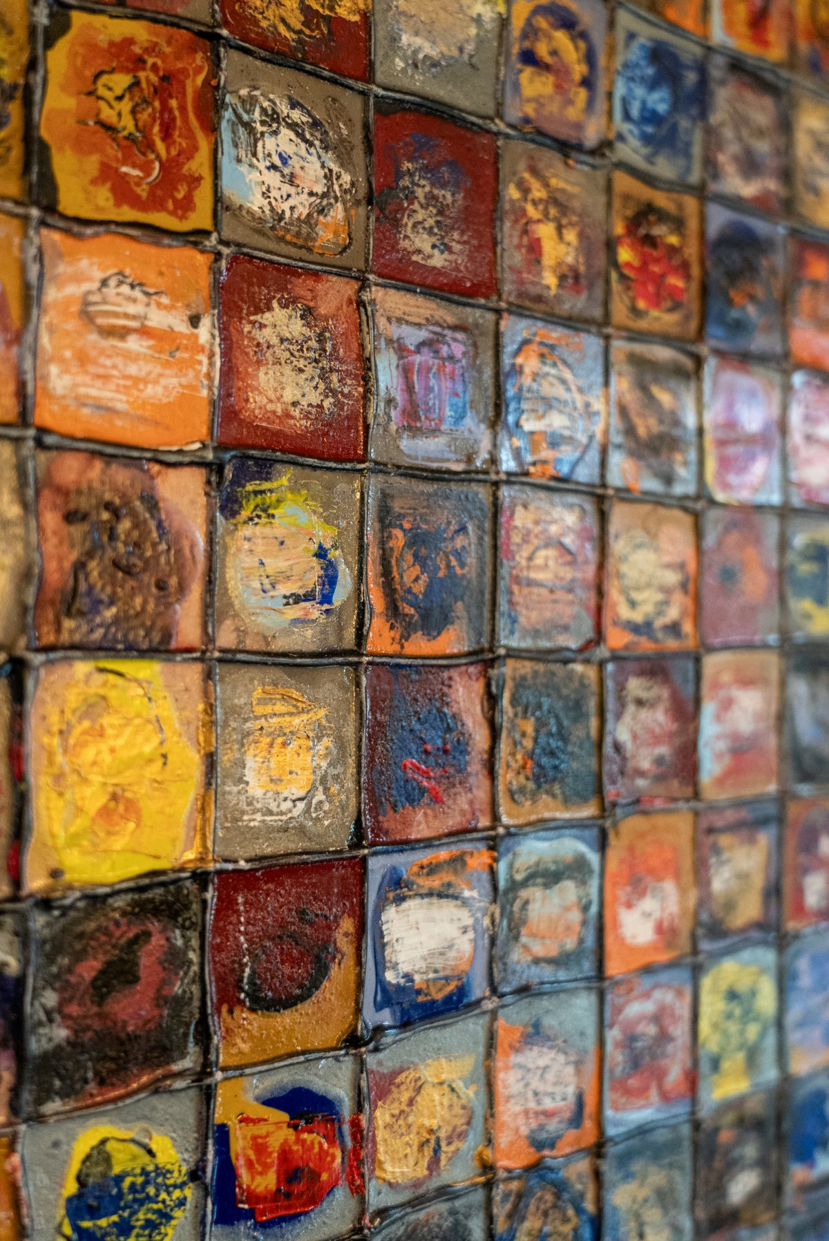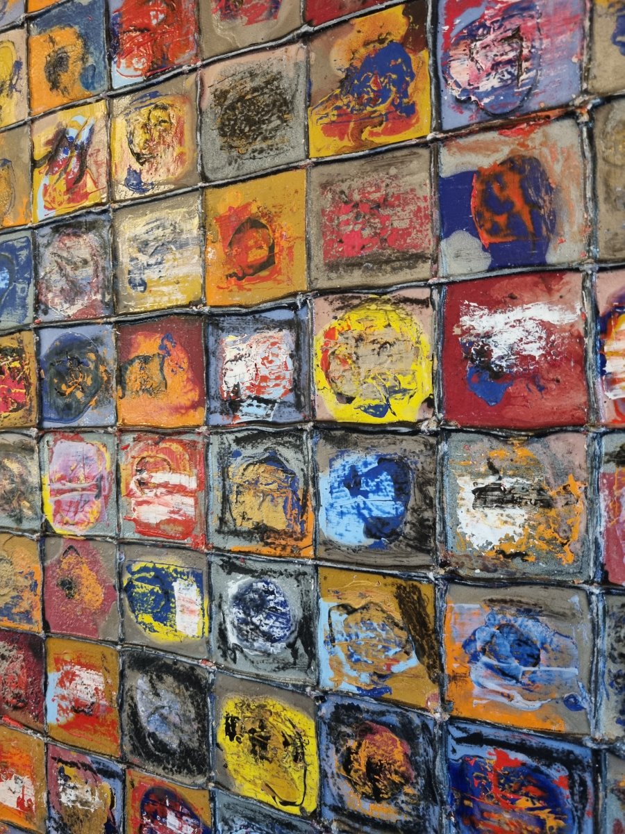 “PhotoBooth” invite le spectateur à un jeu de perception et d’imagination. L’artiste y compose une vaste mosaïque de fragments colorés, comme autant de visages esquissés, souvenirs ou émotions figés dans le temps. Inspirée du photomaton, cette oeuvre évoque une succession d’instantanés anonymes, mais ici, les traits se dissolvent, se mélangent et se réinventent à chaque regard. Chaque carré, travaillé à la peinture acrylique et chargé de matière, devient une cellule vivante, un espace où les formes apparaissent et disparaissent. Les teintes vives — rouges, jaunes, bleus, orangés — vibrent ensemble et créent un mouvement hypnotique, à la frontière entre figuration et abstraction. L’artiste laisse volontairement place à l’interprétation : comme lorsqu’on contemple les nuages, chacun peut y deviner des visages, des silhouettes, des émotions — et construire sa propre histoire. PhotoBooth devient alors un miroir collectif, une galerie d’identités imaginaires où la mémoire et l’inconscient du spectateur prennent part à la création.