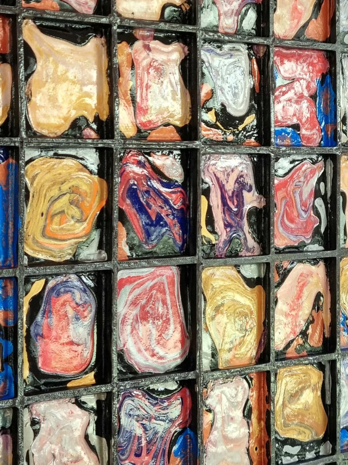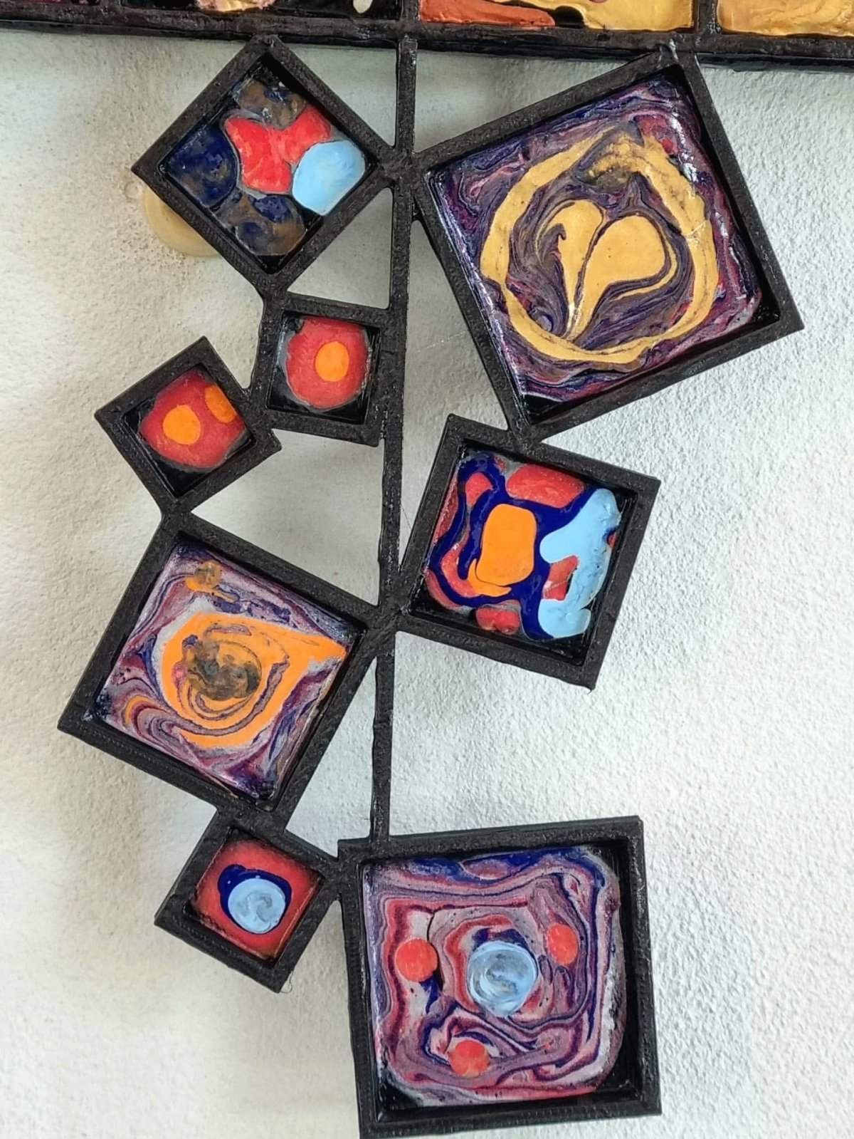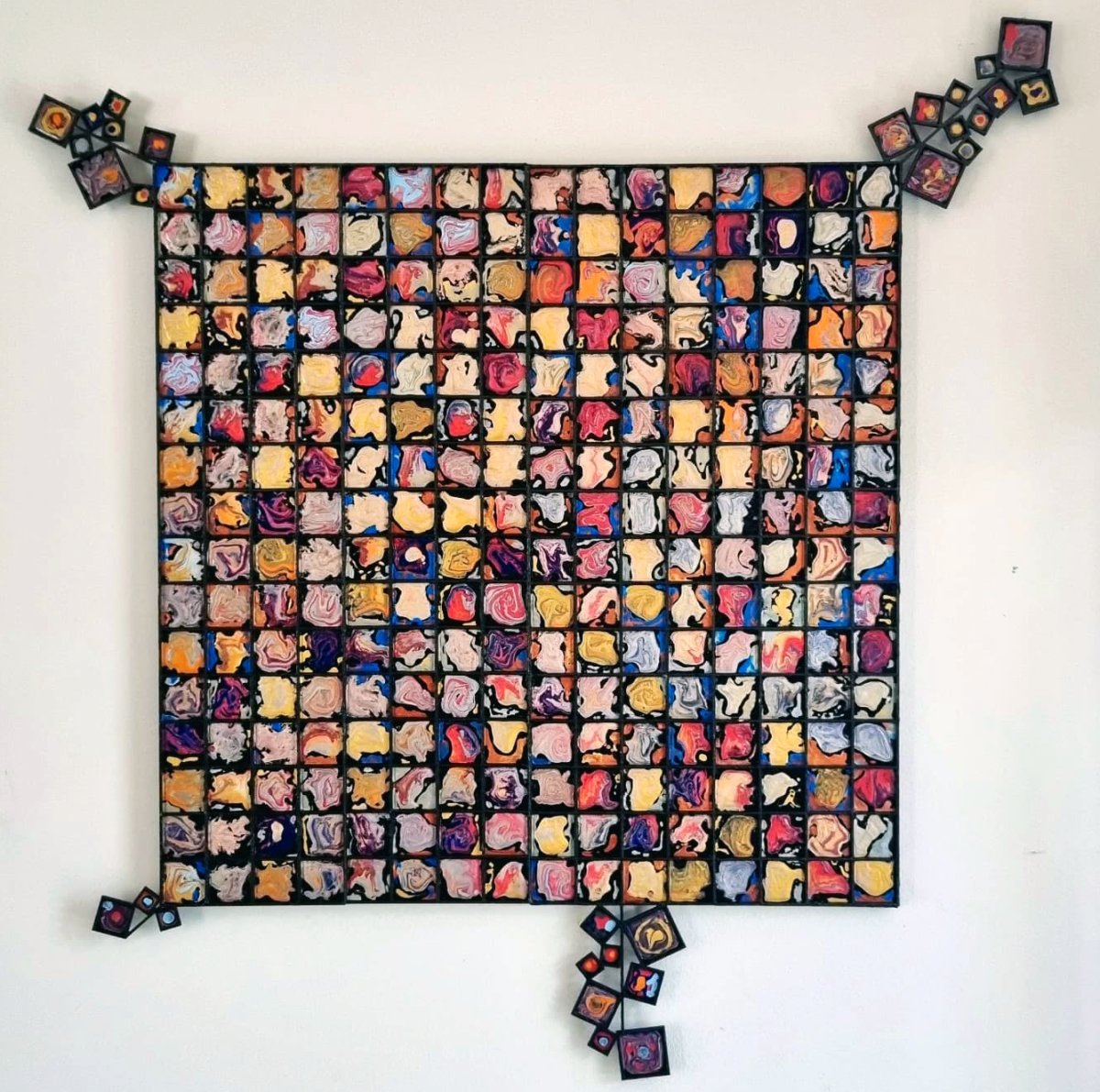 Tel un photomaton interdimensionnel, Quantum Physics capture une série d’instantanés venus d’un univers où les lois de la matière et de l’énergie ne répondent plus aux règles que nous connaissons. Chaque petit carré, aux motifs tourbillonnants et changeants, semble figer une forme éphémère née d’une réalité quantique : un monde en perpétuelle transformation, où les structures apparaissent et se dissolvent comme des particules dans un champ d’énergie invisible. Le quadrillage servant de matrice à ces micro-univers à été réalisé avec une imprimante 3D. Dans chaque case, des peintures acryliques de densités différentes se mêlent et s’interpénètrent sans jamais perdre leur intensité chromatique, créant des marbrures et des mouvements figés dans l’instant. Pour rompre la rigidité du cadre et accentuer la sensation de décalage, des modules carrés sortent littéralement des limites du tableau, brisant la forme rectangulaire traditionnelle. Ces volumes, eux aussi peints à la main, prolongent l’œuvre dans l’espace réel et invitent le spectateur à envisager l’image comme une fenêtre ouverte sur un continuum infini. Entre rigueur de la grille et anarchie des formes, Quantum Physics oscille entre science et poésie visuelle, évoquant à la fois l’infiniment petit et l’infiniment complexe, là où le chaos engendre une beauté imprévisible.
