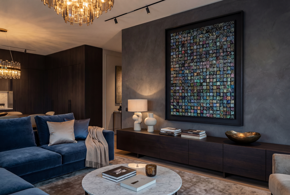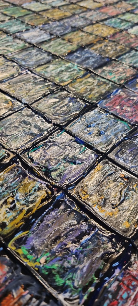 Rays of Life est un tableau abstrait qui explore la naissance de la couleur à partir de l’obscurité. Réalisé à l’acrylique et enrichi de pastel gras, il s’inscrit dans la continuité de la série des Carrés, où chaque module devient une cellule vivante, un fragment d’énergie. À première vue, le tableau peut sembler sombre, presque minéral. Dominé par des tonalités profondes et assourdies, il impose une présence dense, silencieuse. Mais cette apparente obscurité n’est jamais figée. Dès qu’une source de lumière vient effleurer la surface, le tableau se transforme : les couleurs émergent, vibrent et se révèlent dans chaque case, comme si la lumière réveillait une vie cachée. Chaque carré agit comme un réceptacle lumineux. Les pigments, travaillés en épaisseur, accrochent la lumière et la diffractent, laissant apparaître des bleus, des verts, des ocres, des violets et des touches plus chaudes, enfouis sous le noir. Ce jeu entre ombre et éclat crée une expérience presque changeante selon l’angle de vue et l’éclairage, rendant le tableau vivant et évolutif. Rays of Life symbolise ainsi les rayons de la vie qui surgissent de l’obscurité : l’idée que même dans les zones les plus sombres, la couleur, l’énergie et le mouvement existent déjà, en attente d’être révélés. Le noir n’est pas ici une fin, mais un écrin, un point de départ d’où jaillit la lumière. À travers cette composition de 100 × 130 cm, le tableau invite le spectateur à ralentir, à observer attentivement et à se déplacer. Il rappelle que la vie, comme la couleur, se manifeste parfois discrètement, et qu’il suffit d’un rayon de lumière pour transformer la perception du monde.