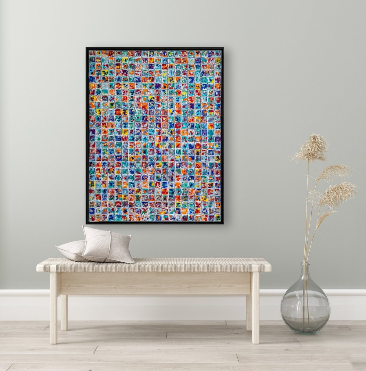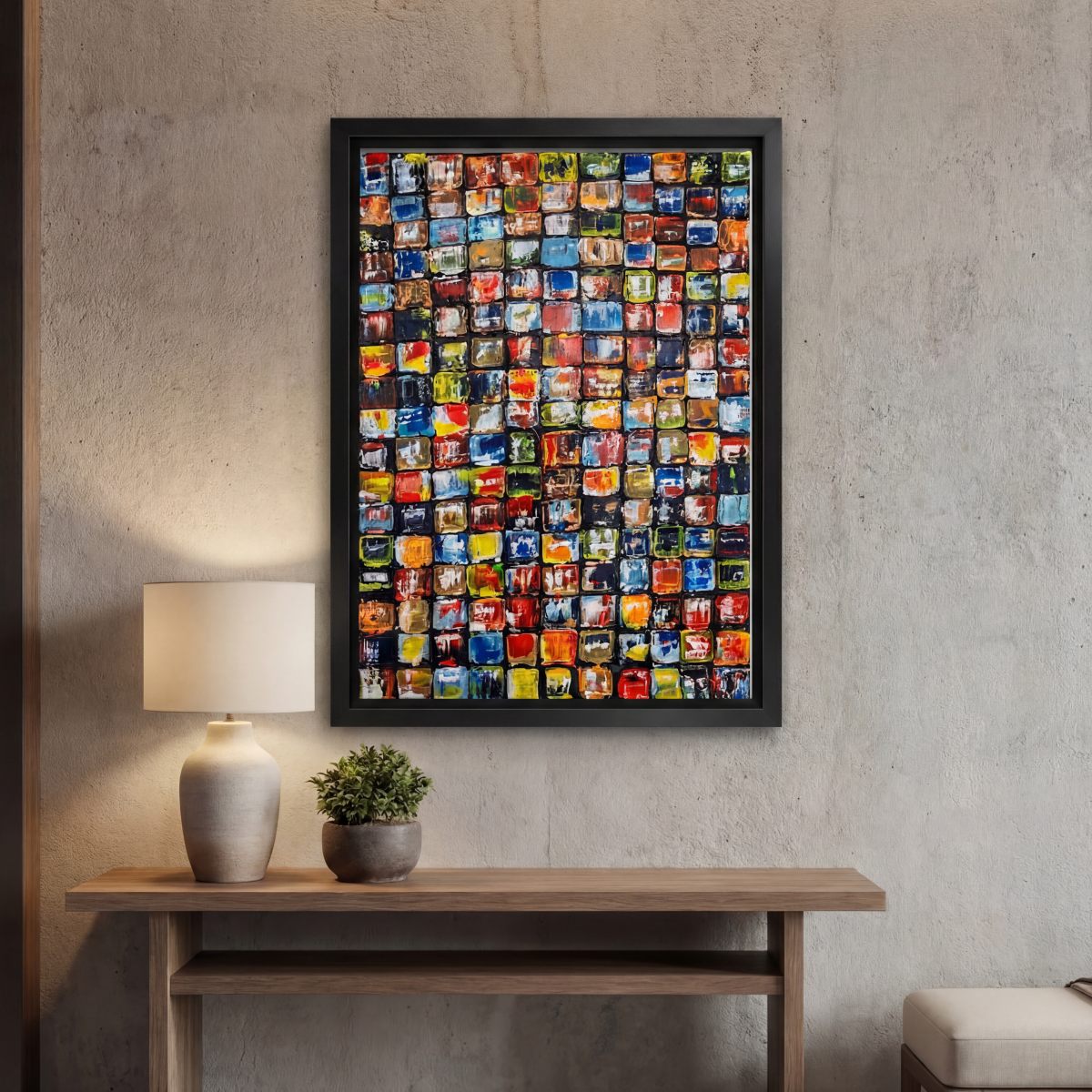 Rays of Life est un tableau abstrait qui explore la naissance de la couleur à partir de l’obscurité. Réalisé à l’acrylique et enrichi de pastel gras, il s’inscrit dans la continuité de la série des Carrés, où chaque module devient une cellule vivante, un fragment d’énergie.