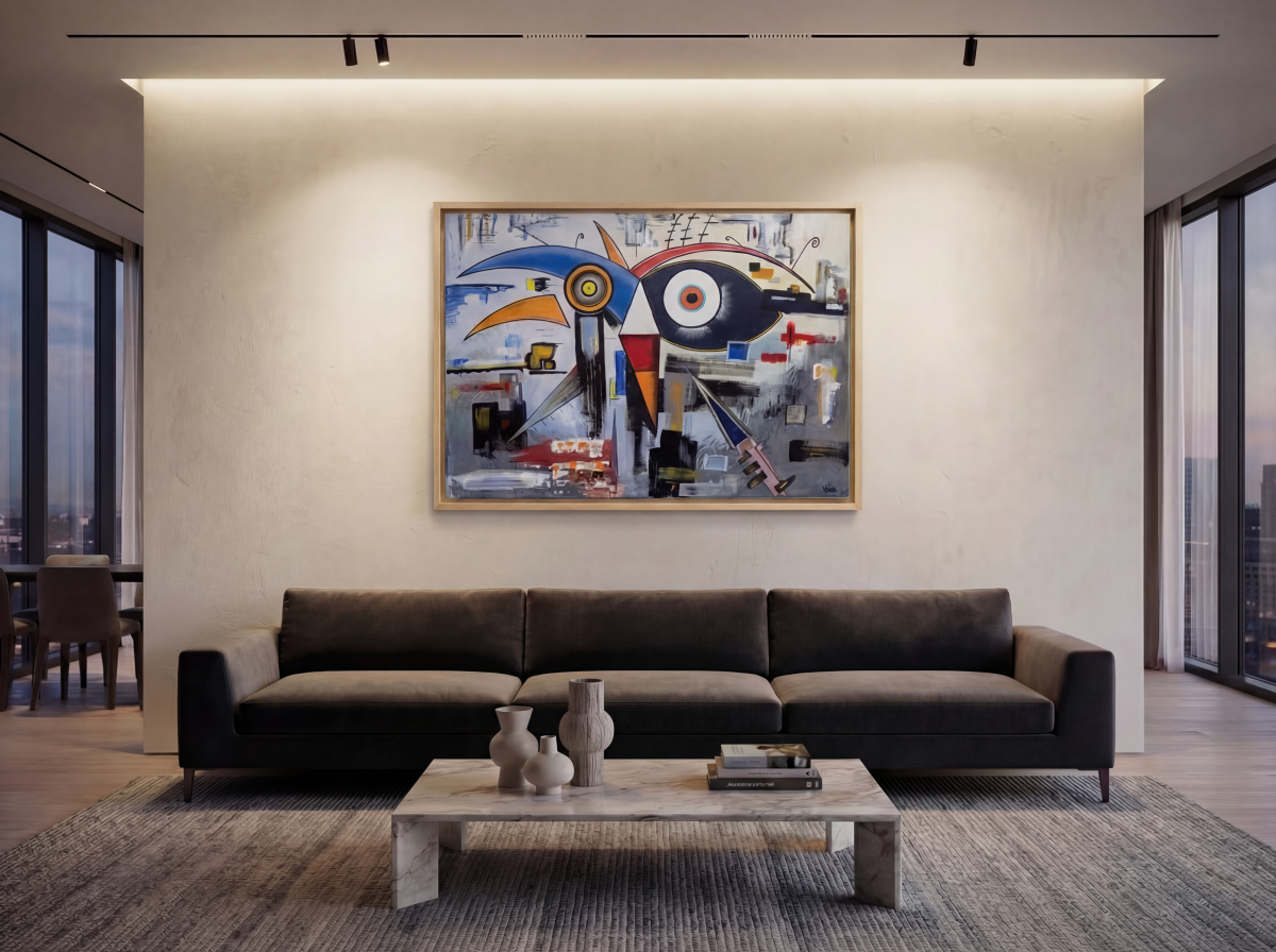 Confused avec ses dimensions imposantes (150 × 100 cm) et ses couleurs vives, il projette le spectateur au cœur du tumulte intérieur que chacun peut ressentir face aux choix et incertitudes de la vie.