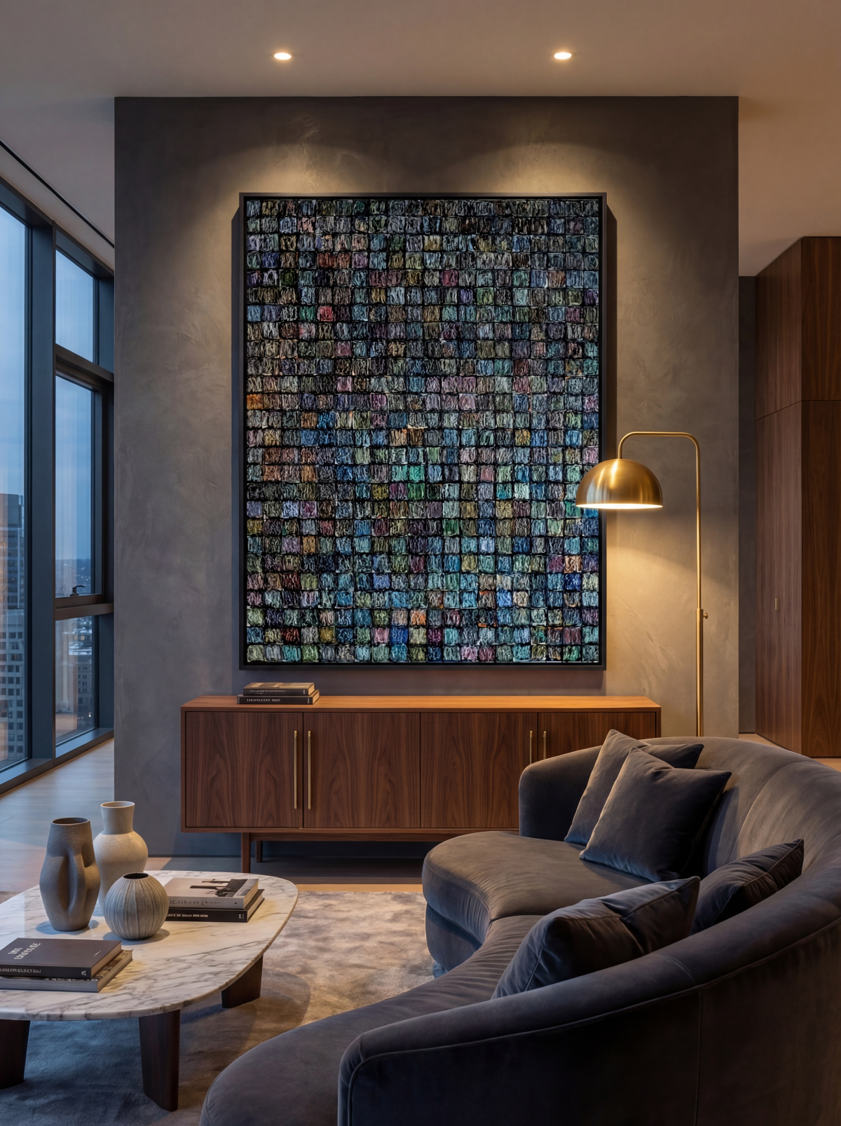 Univers s’inscrit dans la série des Carrés, mais en repousse l’ambition : ici, chaque case devient une fenêtre abstraite ouverte sur le cosmos. L’oeuvre est composée d’une multitude de petits modules créés en impression 3D, ensuite patinés à la peinture dorée